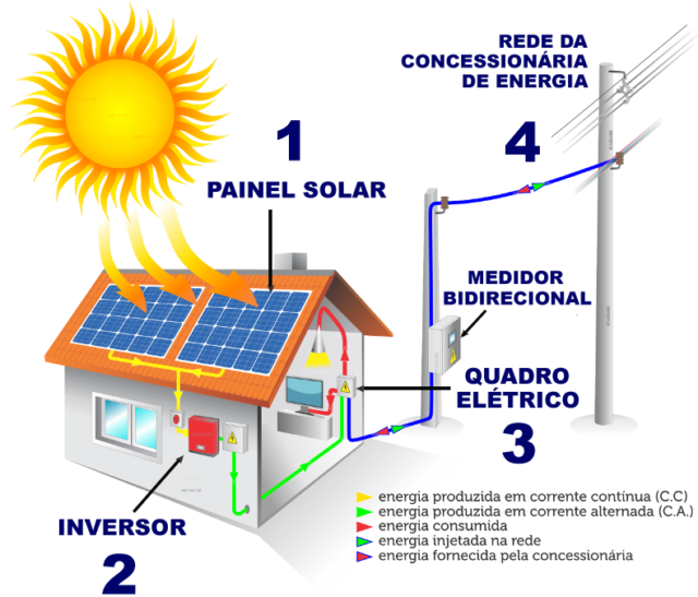 A energia excedente produzida é injetada na rede elétrica, ficando como créditos. E esse saldo positivo de energia poderá ser utilizado para abater o consumo nas faturas dos meses subsequentes.